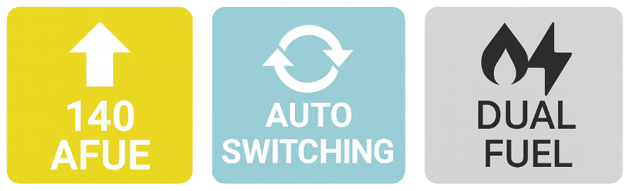 Runs the electric A2W HP when conditions favor a high COP, and switches to GAHP/boiler for cold snaps or high-temp (up to 140 °F) needs.