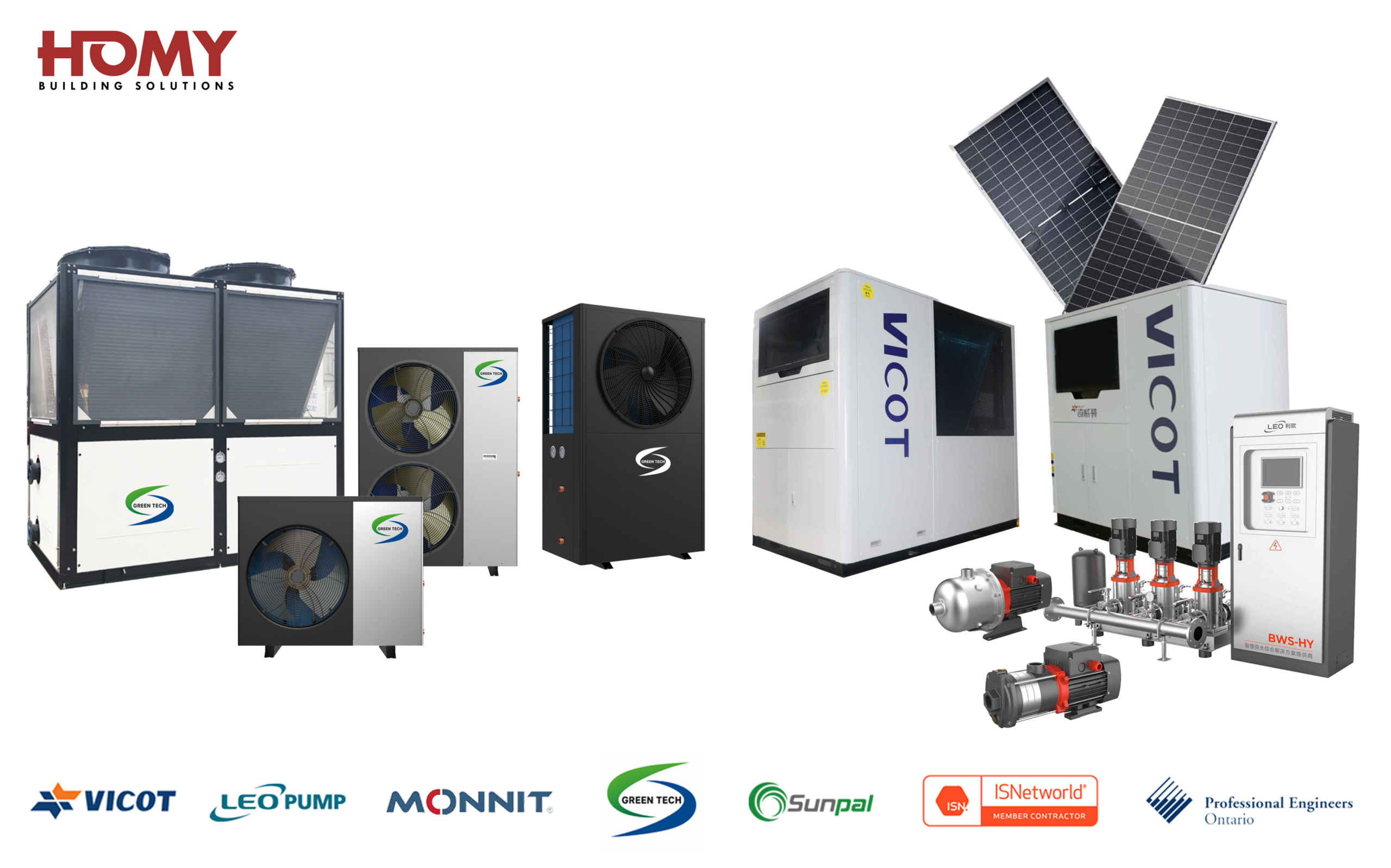 HOMY’s electric heat pump offerings include residential and commercial air-to-water monoblock inverter systems that provide efficient heating, cooling, and hot water capabilities.