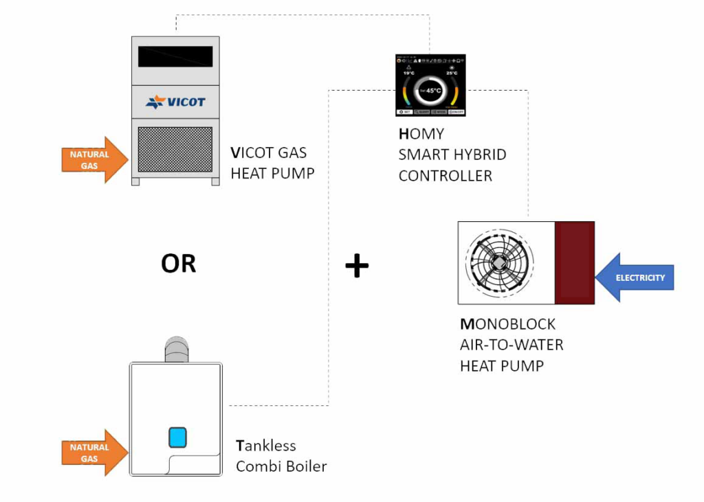 HOMY proudly offers an innovative and advanced HYBRID SOLUTION that seamlessly integrates a highly efficient monoblock air-to-water electrical heat pump with either a top-of-the-line Vicot gas heat pump or a state-of-the-art combi tankless water heater. This unique combination not only enhances energy efficiency but also provides optimal heating and hot water solutions tailored to your specific needs.
